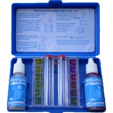 Estojo desenvolvido para análise do pH e Cloro livre na água da piscina. O kit é composto por um tubo de medição duplo com escalas, e reagentes para análise do pH e análise do cloro livre.